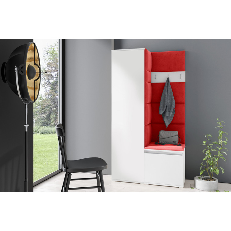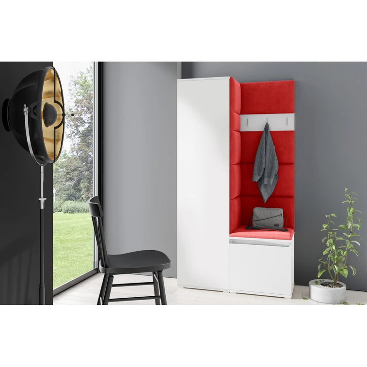 Předsíňová stěna AMI 13, je moderní a praktický prvek do vstupních prostor vašeho domu. Předsíňová stěna obsahuje deset čalouněných panelů, které se montují přímo na stěnu za pomoci lepidla. Potah botníku je tkanina TRINITY, která je měkká a příjemná na dotek. Jedná se o velurovou tkaninu. Předsíňová stěna se skládá z několika částí.
