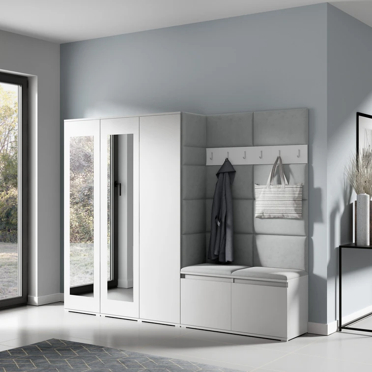 Předsíňová stěna AMI 15, je moderní a praktický prvek do vstupních prostor vašeho domu. Předsíňová stěna obsahuje patnáct čalouněných panelů, které se montují přímo na stěnu za pomoci lepidla. Potah botníku je tkanina TRINITY, která je měkká a příjemná na dotek. Jedná se o velurovou tkaninu. Předsíňová stěna se skládá z několika částí.