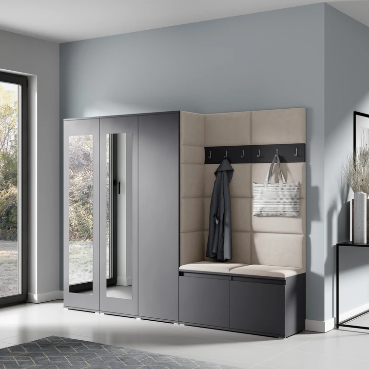 Předsíňová stěna AMI 15, je moderní a praktický prvek do vstupních prostor vašeho domu. Předsíňová stěna obsahuje patnáct čalouněných panelů, které se montují přímo na stěnu za pomoci lepidla. Potah botníku je tkanina TRINITY, která je měkká a příjemná na dotek. Jedná se o velurovou tkaninu. Předsíňová stěna se skládá z několika částí.