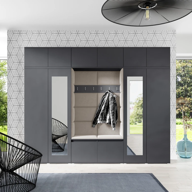 Předsíňová stěna AMI 17, je moderní a praktický prvek do vstupních prostor vašeho domu. Předsíňová stěna obsahuje dvacet čalouněných panelů, které se montují přímo na stěnu za pomoci lepidla. Potah botníku je tkanina TRINITY, která je měkká a příjemná na dotek. Jedná se o velurovou tkaninu. Předsíňová stěna se skládá z několika částí.