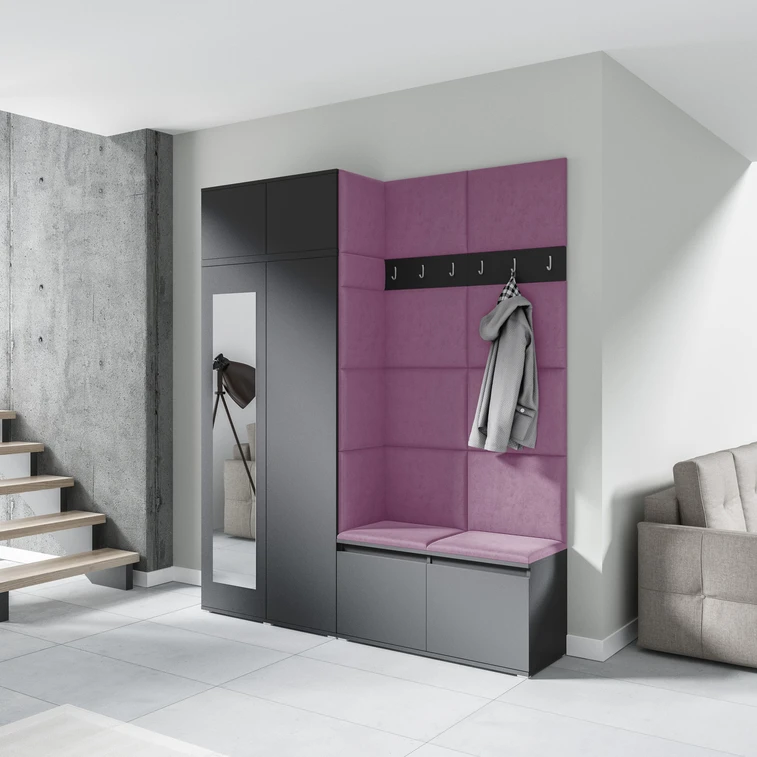 Předsíňová stěna AMI 19, je moderní a praktický prvek do vstupních prostor vašeho domu. Předsíňová stěna obsahuje patnáct čalouněných panelů, které se montují přímo na stěnu za pomoci lepidla. Potah botníku je tkanina TRINITY, která je měkká a příjemná na dotek. Jedná se o velurovou tkaninu. Předsíňová stěna se skládá z několika částí.