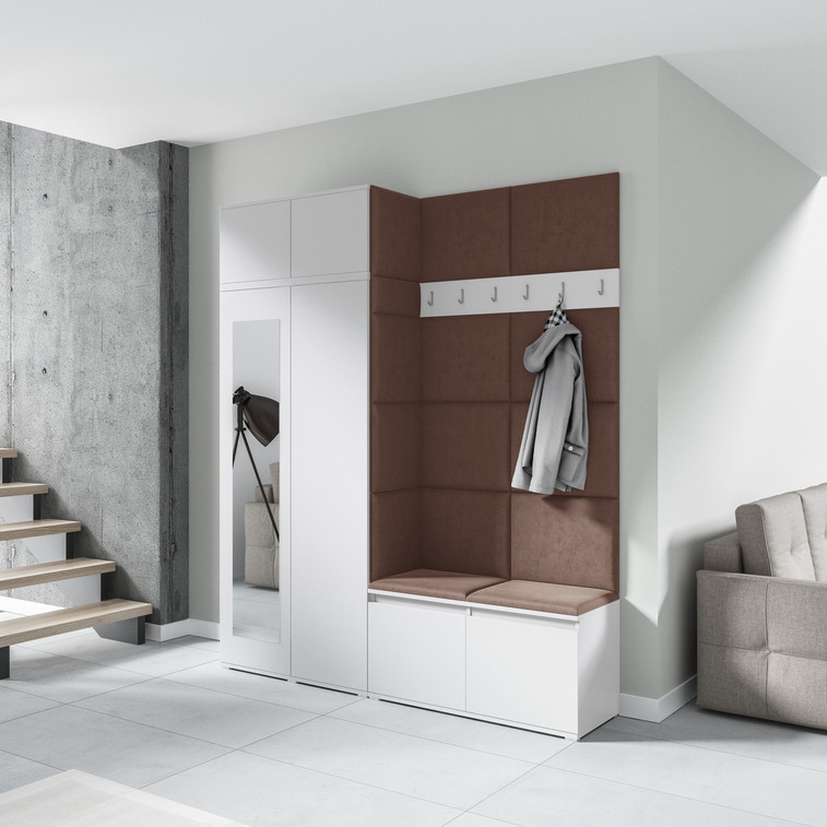 Předsíňová stěna AMI 19, je moderní a praktický prvek do vstupních prostor vašeho domu. Předsíňová stěna obsahuje patnáct čalouněných panelů, které se montují přímo na stěnu za pomoci lepidla. Potah botníku je tkanina TRINITY, která je měkká a příjemná na dotek. Jedná se o velurovou tkaninu. Předsíňová stěna se skládá z několika částí.
