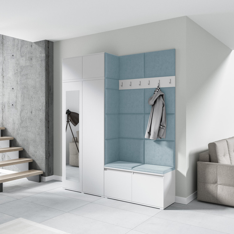 Předsíňová stěna AMI 19, je moderní a praktický prvek do vstupních prostor vašeho domu. Předsíňová stěna obsahuje patnáct čalouněných panelů, které se montují přímo na stěnu za pomoci lepidla. Potah botníku je tkanina TRINITY, která je měkká a příjemná na dotek. Jedná se o velurovou tkaninu. Předsíňová stěna se skládá z několika částí.