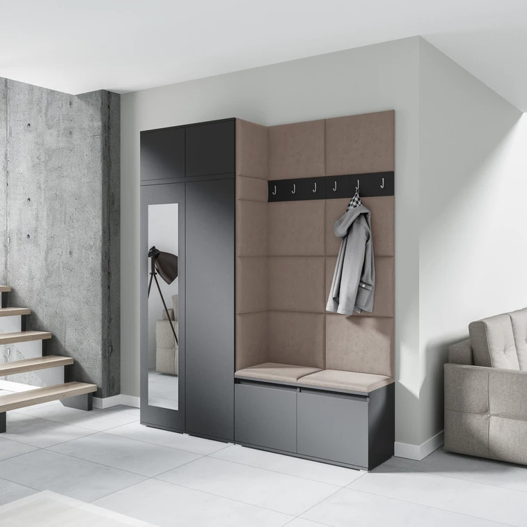 Předsíňová stěna AMI 19, je moderní a praktický prvek do vstupních prostor vašeho domu. Předsíňová stěna obsahuje patnáct čalouněných panelů, které se montují přímo na stěnu za pomoci lepidla. Potah botníku je tkanina TRINITY, která je měkká a příjemná na dotek. Jedná se o velurovou tkaninu. Předsíňová stěna se skládá z několika částí.
