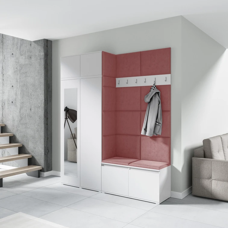 Předsíňová stěna AMI 19, je moderní a praktický prvek do vstupních prostor vašeho domu. Předsíňová stěna obsahuje patnáct čalouněných panelů, které se montují přímo na stěnu za pomoci lepidla. Potah botníku je tkanina TRINITY, která je měkká a příjemná na dotek. Jedná se o velurovou tkaninu. Předsíňová stěna se skládá z několika částí.
