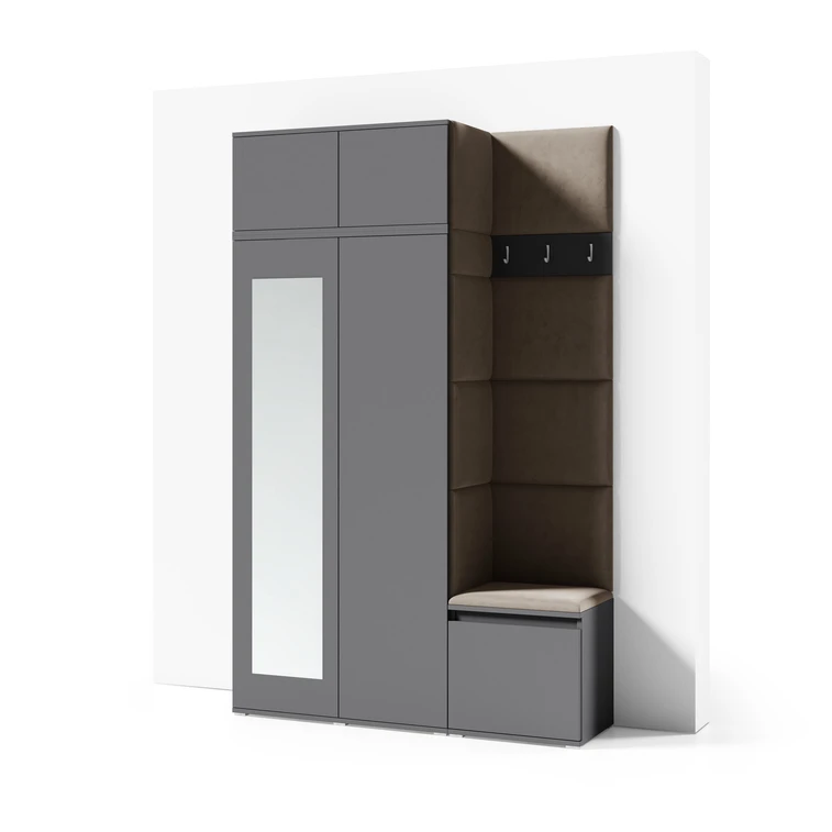 Předsíňová stěna AMI 20, je moderní a praktický prvek do vstupních prostor vašeho domu. Předsíňová stěna obsahuje deset čalouněných panelů, které se montují přímo na stěnu za pomoci lepidla. Potah botníku je tkanina TRINITY, která je měkká a příjemná na dotek. Jedná se o velurovou tkaninu. Předsíňová stěna se skládá z několika částí.