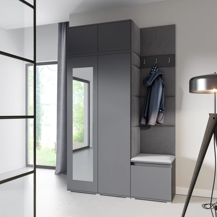 Předsíňová stěna AMI 20, je moderní a praktický prvek do vstupních prostor vašeho domu. Předsíňová stěna obsahuje deset čalouněných panelů, které se montují přímo na stěnu za pomoci lepidla. Potah botníku je tkanina TRINITY, která je měkká a příjemná na dotek. Jedná se o velurovou tkaninu. Předsíňová stěna se skládá z několika částí.