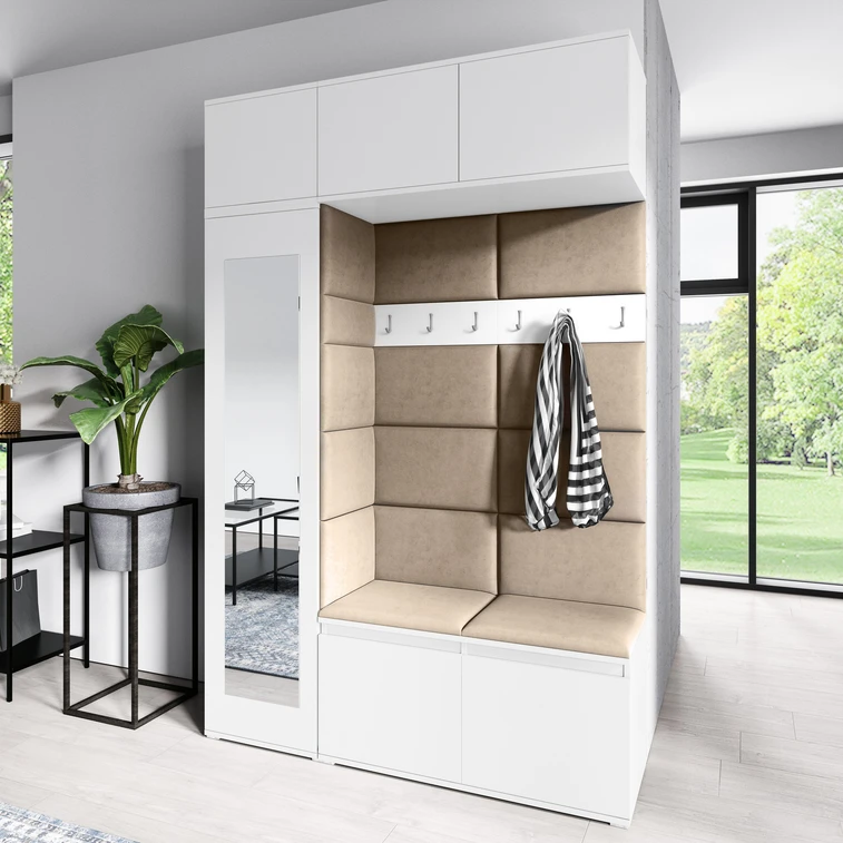Předsíňová stěna AMI 21, je moderní a praktický prvek do vstupních prostor vašeho domu. Předsíňová stěna obsahuje patnáct čalouněných panelů, které se montují přímo na stěnu za pomoci lepidla. Potah botníku je tkanina TRINITY, která je měkká a příjemná na dotek. Jedná se o velurovou tkaninu. Předsíňová stěna se skládá z několika částí.