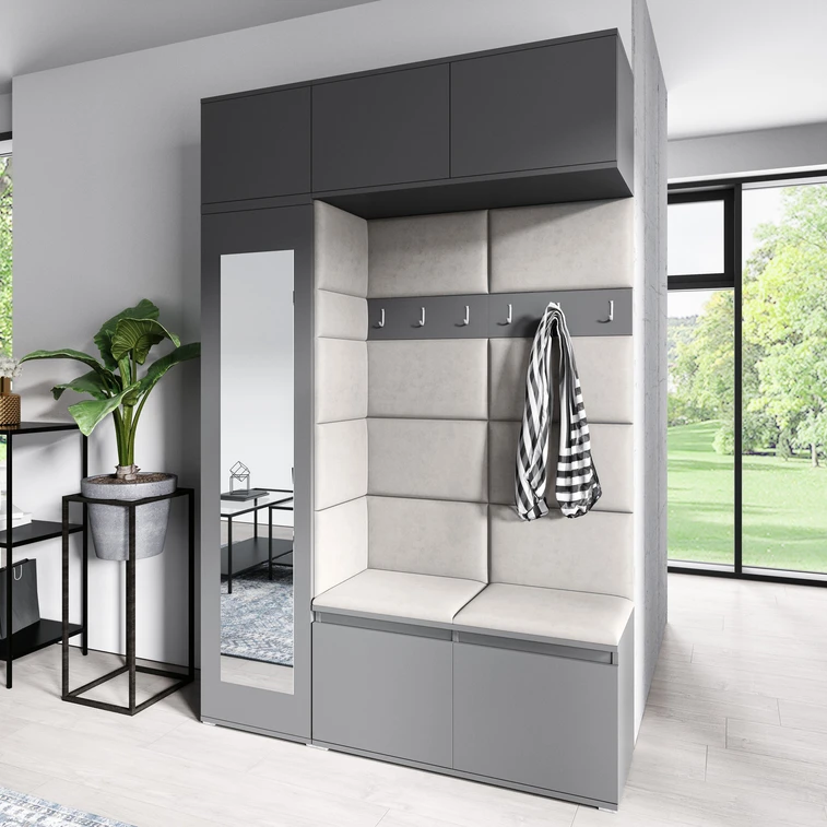 Předsíňová stěna AMI 21, je moderní a praktický prvek do vstupních prostor vašeho domu. Předsíňová stěna obsahuje patnáct čalouněných panelů, které se montují přímo na stěnu za pomoci lepidla. Potah botníku je tkanina TRINITY, která je měkká a příjemná na dotek. Jedná se o velurovou tkaninu. Předsíňová stěna se skládá z několika částí.