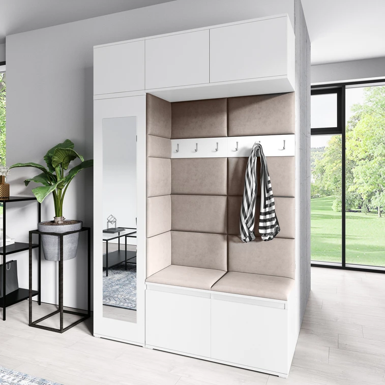 Předsíňová stěna AMI 21, je moderní a praktický prvek do vstupních prostor vašeho domu. Předsíňová stěna obsahuje patnáct čalouněných panelů, které se montují přímo na stěnu za pomoci lepidla. Potah botníku je tkanina TRINITY, která je měkká a příjemná na dotek. Jedná se o velurovou tkaninu. Předsíňová stěna se skládá z několika částí.