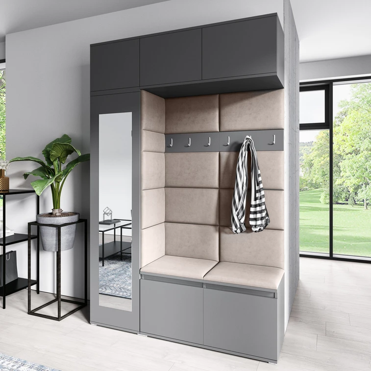 Předsíňová stěna AMI 21, je moderní a praktický prvek do vstupních prostor vašeho domu. Předsíňová stěna obsahuje patnáct čalouněných panelů, které se montují přímo na stěnu za pomoci lepidla. Potah botníku je tkanina TRINITY, která je měkká a příjemná na dotek. Jedná se o velurovou tkaninu. Předsíňová stěna se skládá z několika částí.
