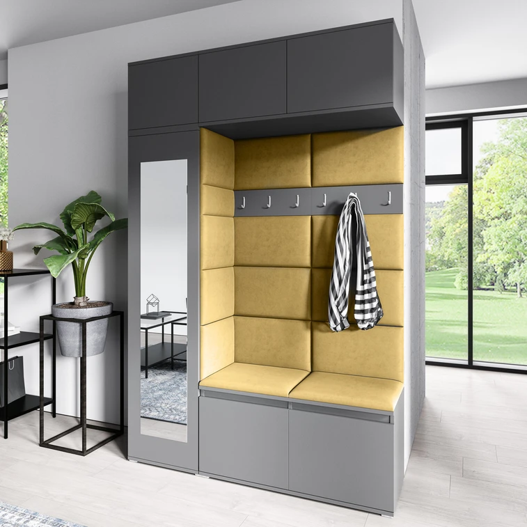 Předsíňová stěna AMI 21, je moderní a praktický prvek do vstupních prostor vašeho domu. Předsíňová stěna obsahuje patnáct čalouněných panelů, které se montují přímo na stěnu za pomoci lepidla. Potah botníku je tkanina TRINITY, která je měkká a příjemná na dotek. Jedná se o velurovou tkaninu. Předsíňová stěna se skládá z několika částí.