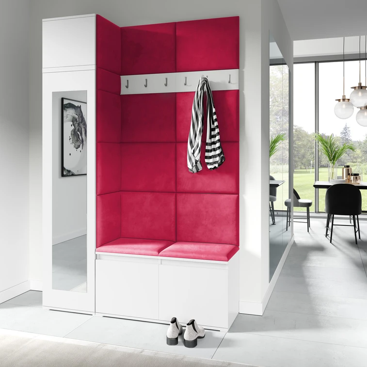 Předsíňová stěna AMI 22, je moderní a praktický prvek do vstupních prostor vašeho domu. Předsíňová stěna obsahuje patnáct čalouněných panelů, které se montují přímo na stěnu za pomoci lepidla. Potah botníku je tkanina TRINITY, která je měkká a příjemná na dotek. Jedná se o velurovou tkaninu. Předsíňová stěna se skládá z několika částí.