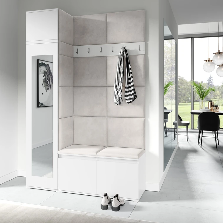 Předsíňová stěna AMI 22, je moderní a praktický prvek do vstupních prostor vašeho domu. Předsíňová stěna obsahuje patnáct čalouněných panelů, které se montují přímo na stěnu za pomoci lepidla. Potah botníku je tkanina TRINITY, která je měkká a příjemná na dotek. Jedná se o velurovou tkaninu. Předsíňová stěna se skládá z několika částí.