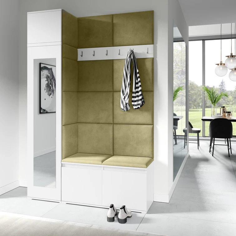 Předsíňová stěna AMI 22, je moderní a praktický prvek do vstupních prostor vašeho domu. Předsíňová stěna obsahuje patnáct čalouněných panelů, které se montují přímo na stěnu za pomoci lepidla. Potah botníku je tkanina TRINITY, která je měkká a příjemná na dotek. Jedná se o velurovou tkaninu. Předsíňová stěna se skládá z několika částí.
