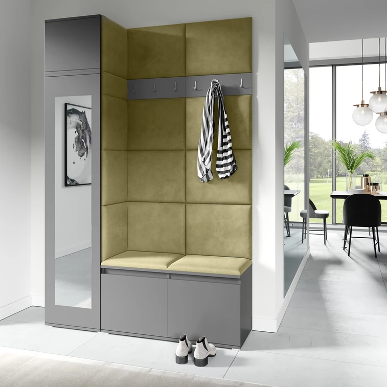 Předsíňová stěna AMI 22, je moderní a praktický prvek do vstupních prostor vašeho domu. Předsíňová stěna obsahuje patnáct čalouněných panelů, které se montují přímo na stěnu za pomoci lepidla. Potah botníku je tkanina TRINITY, která je měkká a příjemná na dotek. Jedná se o velurovou tkaninu. Předsíňová stěna se skládá z několika částí.