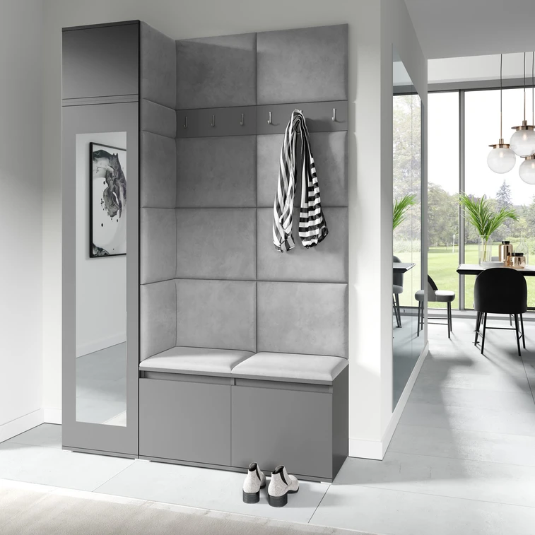 Předsíňová stěna AMI 22, je moderní a praktický prvek do vstupních prostor vašeho domu. Předsíňová stěna obsahuje patnáct čalouněných panelů, které se montují přímo na stěnu za pomoci lepidla. Potah botníku je tkanina TRINITY, která je měkká a příjemná na dotek. Jedná se o velurovou tkaninu. Předsíňová stěna se skládá z několika částí.