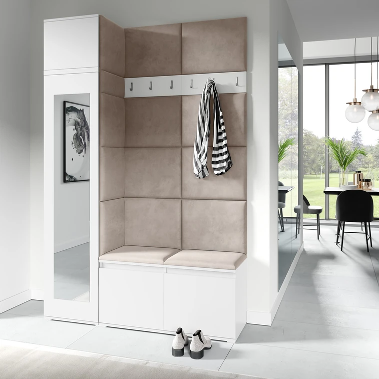 Předsíňová stěna AMI 22, je moderní a praktický prvek do vstupních prostor vašeho domu. Předsíňová stěna obsahuje patnáct čalouněných panelů, které se montují přímo na stěnu za pomoci lepidla. Potah botníku je tkanina TRINITY, která je měkká a příjemná na dotek. Jedná se o velurovou tkaninu. Předsíňová stěna se skládá z několika částí.