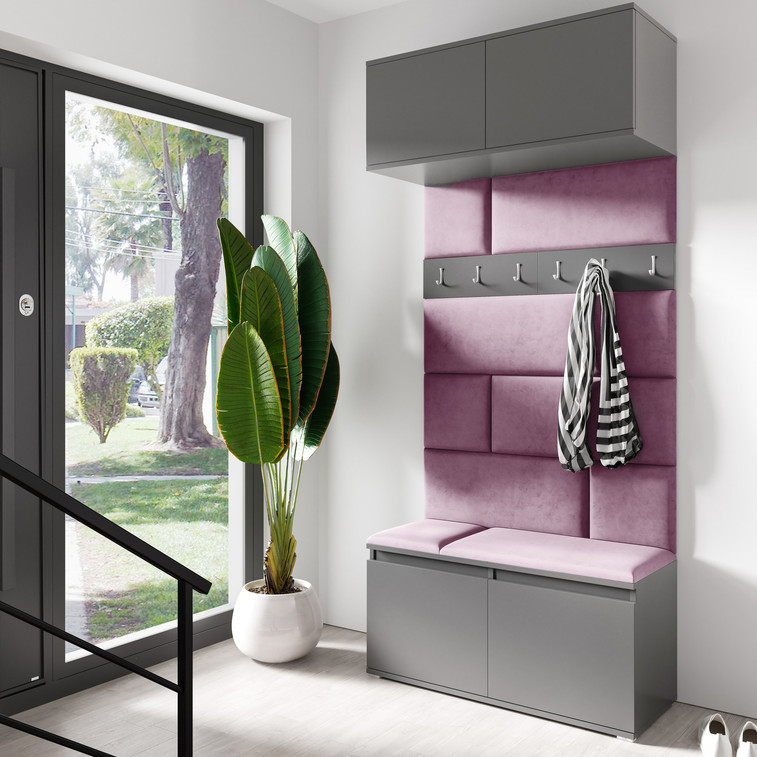 Předsíňová stěna je moderní a praktický prvek do vstupních prostor vašeho domu. Obsahuje 10 čalouněných panelů, které se montují přímo na stěnu za pomoci lepidla. Potah botníku je tkanina TRINITY, která je měkká a příjemná na dotek. Jedná se o velurovou tkaninu. Předsíňová stěna se skládá z několika částí.