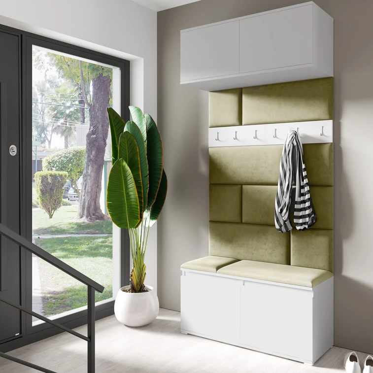 Předsíňová stěna je moderní a praktický prvek do vstupních prostor vašeho domu. Obsahuje 10 čalouněných panelů, které se montují přímo na stěnu za pomoci lepidla. Potah botníku je tkanina TRINITY, která je měkká a příjemná na dotek. Jedná se o velurovou tkaninu. Předsíňová stěna se skládá z několika částí.