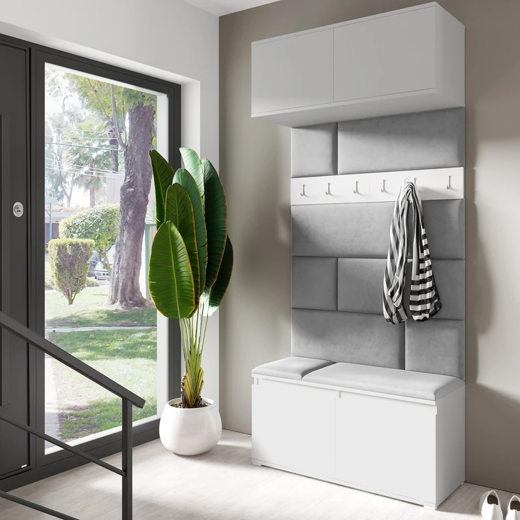 Předsíňová stěna je moderní a praktický prvek do vstupních prostor vašeho domu. Obsahuje 10 čalouněných panelů, které se montují přímo na stěnu za pomoci lepidla. Potah botníku je tkanina TRINITY, která je měkká a příjemná na dotek. Jedná se o velurovou tkaninu. Předsíňová stěna se skládá z několika částí.