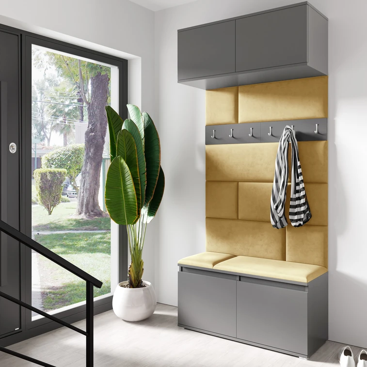 Předsíňová stěna je moderní a praktický prvek do vstupních prostor vašeho domu. Obsahuje 10 čalouněných panelů, které se montují přímo na stěnu za pomoci lepidla. Potah botníku je tkanina TRINITY, která je měkká a příjemná na dotek. Jedná se o velurovou tkaninu. Předsíňová stěna se skládá z několika částí.