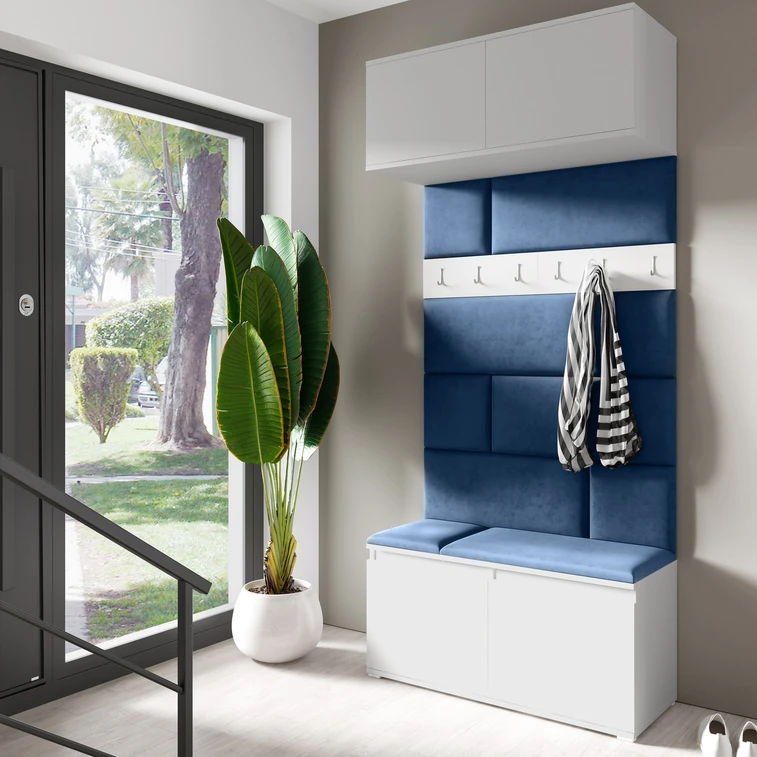 Předsíňová stěna je moderní a praktický prvek do vstupních prostor vašeho domu. Obsahuje 10 čalouněných panelů, které se montují přímo na stěnu za pomoci lepidla. Potah botníku je tkanina TRINITY, která je měkká a příjemná na dotek. Jedná se o velurovou tkaninu. Předsíňová stěna se skládá z několika částí.