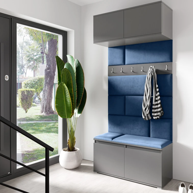 Předsíňová stěna je moderní a praktický prvek do vstupních prostor vašeho domu. Obsahuje 10 čalouněných panelů, které se montují přímo na stěnu za pomoci lepidla. Potah botníku je tkanina TRINITY, která je měkká a příjemná na dotek. Jedná se o velurovou tkaninu. Předsíňová stěna se skládá z několika částí.