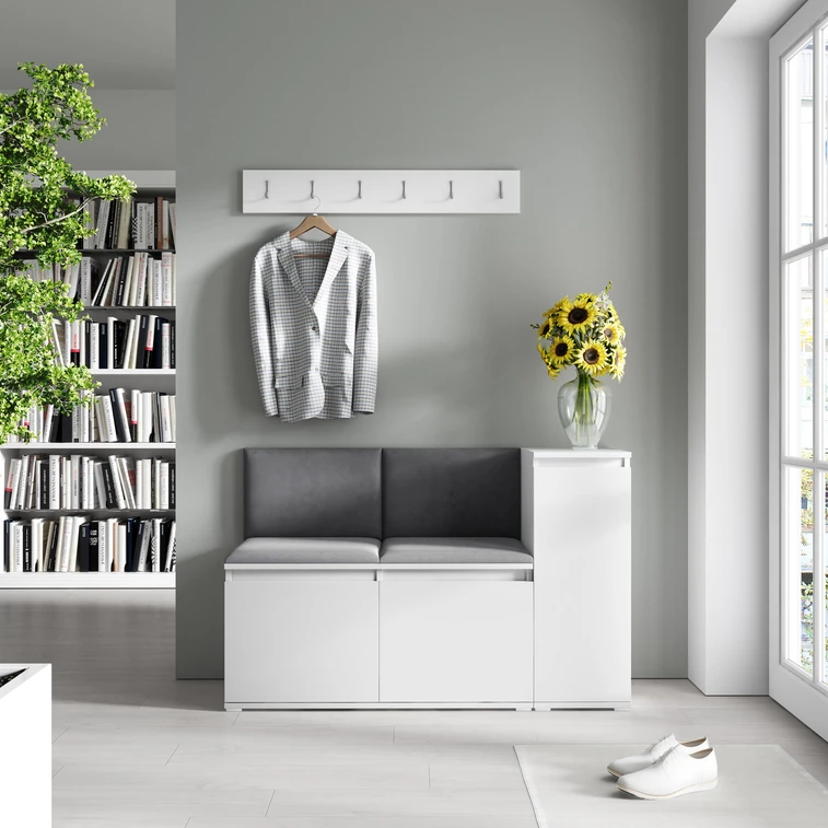 Předsíňová stěna AMI 25, je moderní a praktický prvek do vstupních prostor vašeho domu. Předsíňová stěna obsahuje čtyři čalouněné panely, které se montují přímo na stěnu za pomoci lepidla. Potah botníku je tkanina TRINITY, která je měkká a příjemná na dotek. Jedná se o velurovou tkaninu. Předsíňová stěna se skládá z několika částí.