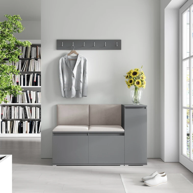 Předsíňová stěna AMI 25, je moderní a praktický prvek do vstupních prostor vašeho domu. Předsíňová stěna obsahuje čtyři čalouněné panely, které se montují přímo na stěnu za pomoci lepidla. Potah botníku je tkanina TRINITY, která je měkká a příjemná na dotek. Jedná se o velurovou tkaninu. Předsíňová stěna se skládá z několika částí.