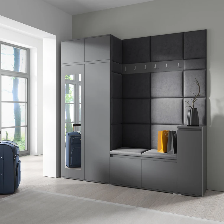 Předsíňová stěna AMI 26, je moderní a praktický prvek do vstupních prostor vašeho domu. Předsíňová stěna obsahuje devatenáct čalouněných panelů, které se montují přímo na stěnu za pomoci lepidla. Potah botníku je tkanina TRINITY, která je měkká a příjemná na dotek. Jedná se o velurovou tkaninu. Předsíňová stěna se skládá z několika částí.