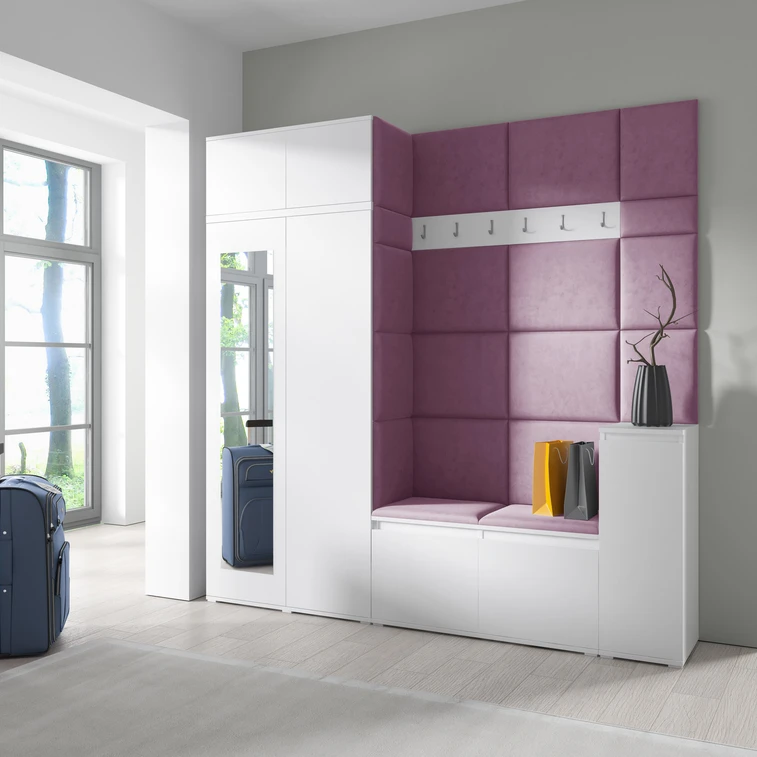 Předsíňová stěna AMI 26, je moderní a praktický prvek do vstupních prostor vašeho domu. Předsíňová stěna obsahuje devatenáct čalouněných panelů, které se montují přímo na stěnu za pomoci lepidla. Potah botníku je tkanina TRINITY, která je měkká a příjemná na dotek. Jedná se o velurovou tkaninu. Předsíňová stěna se skládá z několika částí.
