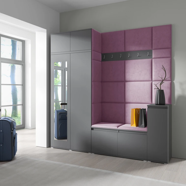 Předsíňová stěna AMI 26, je moderní a praktický prvek do vstupních prostor vašeho domu. Předsíňová stěna obsahuje devatenáct čalouněných panelů, které se montují přímo na stěnu za pomoci lepidla. Potah botníku je tkanina TRINITY, která je měkká a příjemná na dotek. Jedná se o velurovou tkaninu. Předsíňová stěna se skládá z několika částí.