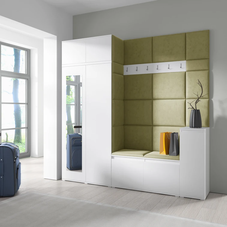 Předsíňová stěna AMI 26, je moderní a praktický prvek do vstupních prostor vašeho domu. Předsíňová stěna obsahuje devatenáct čalouněných panelů, které se montují přímo na stěnu za pomoci lepidla. Potah botníku je tkanina TRINITY, která je měkká a příjemná na dotek. Jedná se o velurovou tkaninu. Předsíňová stěna se skládá z několika částí.