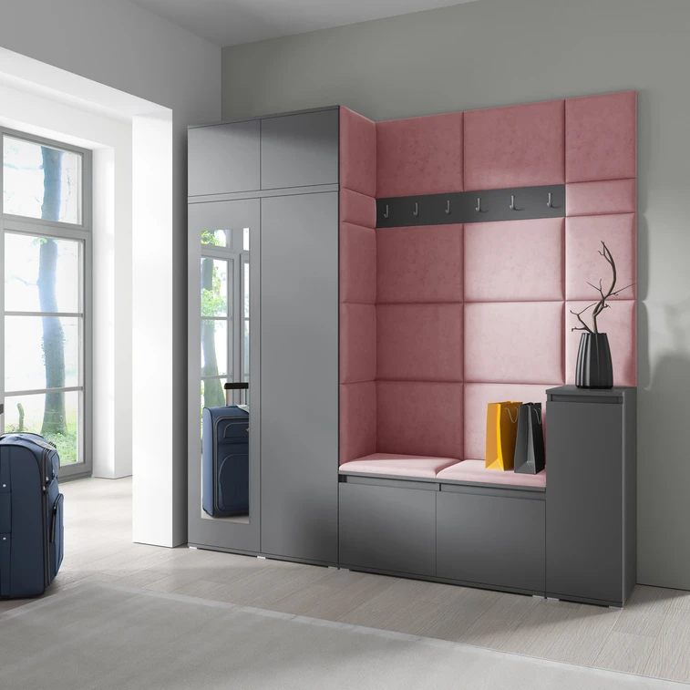 Předsíňová stěna AMI 26, je moderní a praktický prvek do vstupních prostor vašeho domu. Předsíňová stěna obsahuje devatenáct čalouněných panelů, které se montují přímo na stěnu za pomoci lepidla. Potah botníku je tkanina TRINITY, která je měkká a příjemná na dotek. Jedná se o velurovou tkaninu. Předsíňová stěna se skládá z několika částí.