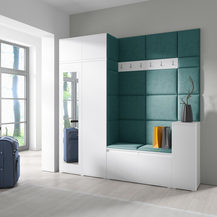 Předsíňová stěna AMI 26, je moderní a praktický prvek do vstupních prostor vašeho domu. Předsíňová stěna obsahuje devatenáct čalouněných panelů, které se montují přímo na stěnu za pomoci lepidla. Potah botníku je tkanina TRINITY, která je měkká a příjemná na dotek. Jedná se o velurovou tkaninu. Předsíňová stěna se skládá z několika částí.