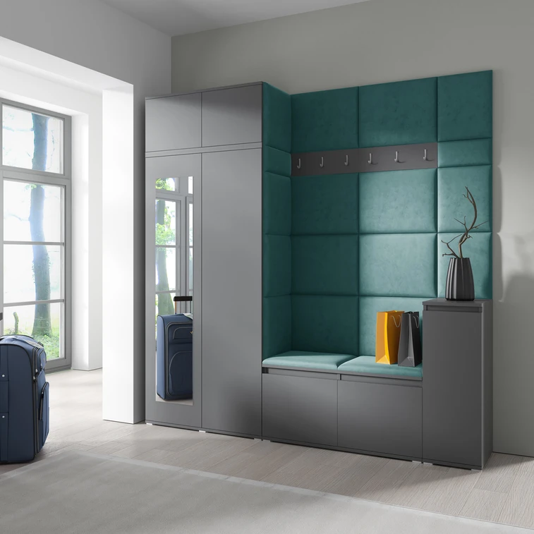 Předsíňová stěna AMI 26, je moderní a praktický prvek do vstupních prostor vašeho domu. Předsíňová stěna obsahuje devatenáct čalouněných panelů, které se montují přímo na stěnu za pomoci lepidla. Potah botníku je tkanina TRINITY, která je měkká a příjemná na dotek. Jedná se o velurovou tkaninu. Předsíňová stěna se skládá z několika částí.