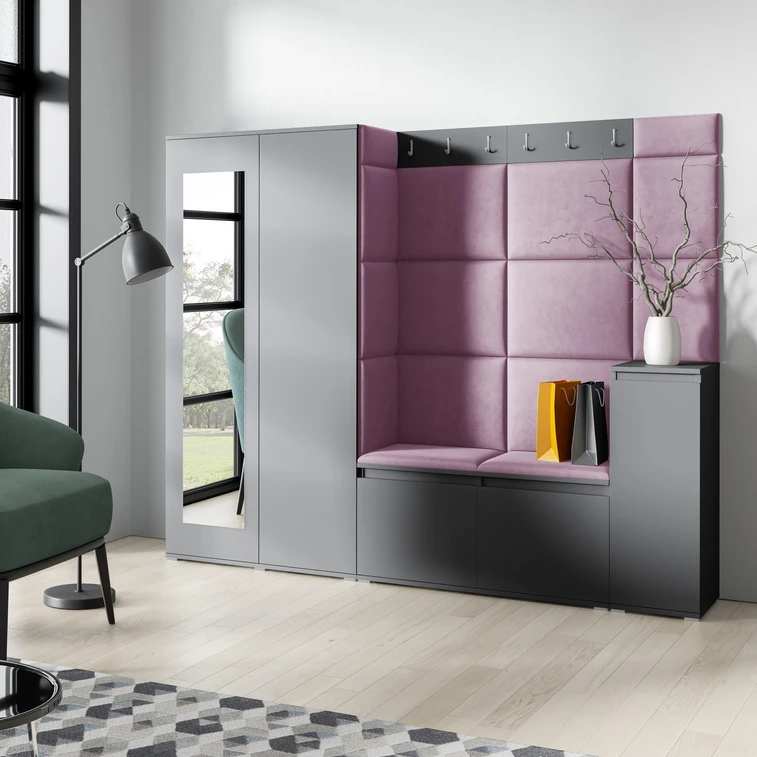 Předsíňová stěna AMI 27, je moderní a praktický prvek do vstupních prostor vašeho domu. Předsíňová stěna obsahuje patnáct čalouněných panelů, které se montují přímo na stěnu za pomoci lepidla. Potah botníku je tkanina TRINITY, která je měkká a příjemná na dotek. Jedná se o velurovou tkaninu. Předsíňová stěna se skládá z několika částí.