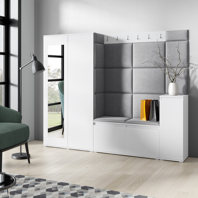 Předsíňová stěna AMI 27, je moderní a praktický prvek do vstupních prostor vašeho domu. Předsíňová stěna obsahuje patnáct čalouněných panelů, které se montují přímo na stěnu za pomoci lepidla. Potah botníku je tkanina TRINITY, která je měkká a příjemná na dotek. Jedná se o velurovou tkaninu. Předsíňová stěna se skládá z několika částí.