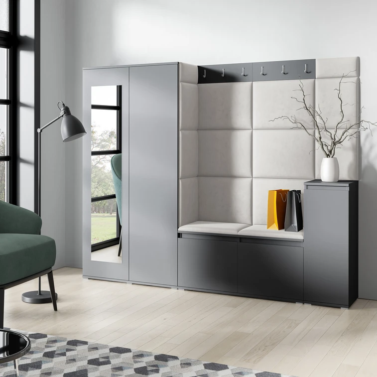 Předsíňová stěna AMI 27, je moderní a praktický prvek do vstupních prostor vašeho domu. Předsíňová stěna obsahuje patnáct čalouněných panelů, které se montují přímo na stěnu za pomoci lepidla. Potah botníku je tkanina TRINITY, která je měkká a příjemná na dotek. Jedná se o velurovou tkaninu. Předsíňová stěna se skládá z několika částí.