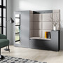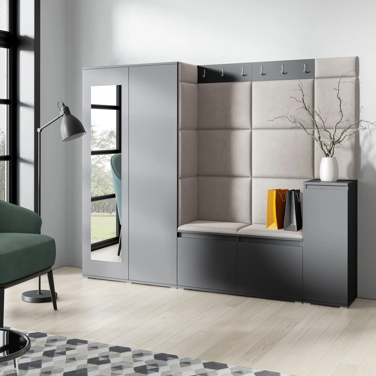 Předsíňová stěna AMI 27, je moderní a praktický prvek do vstupních prostor vašeho domu. Předsíňová stěna obsahuje patnáct čalouněných panelů, které se montují přímo na stěnu za pomoci lepidla. Potah botníku je tkanina TRINITY, která je měkká a příjemná na dotek. Jedná se o velurovou tkaninu. Předsíňová stěna se skládá z několika částí.