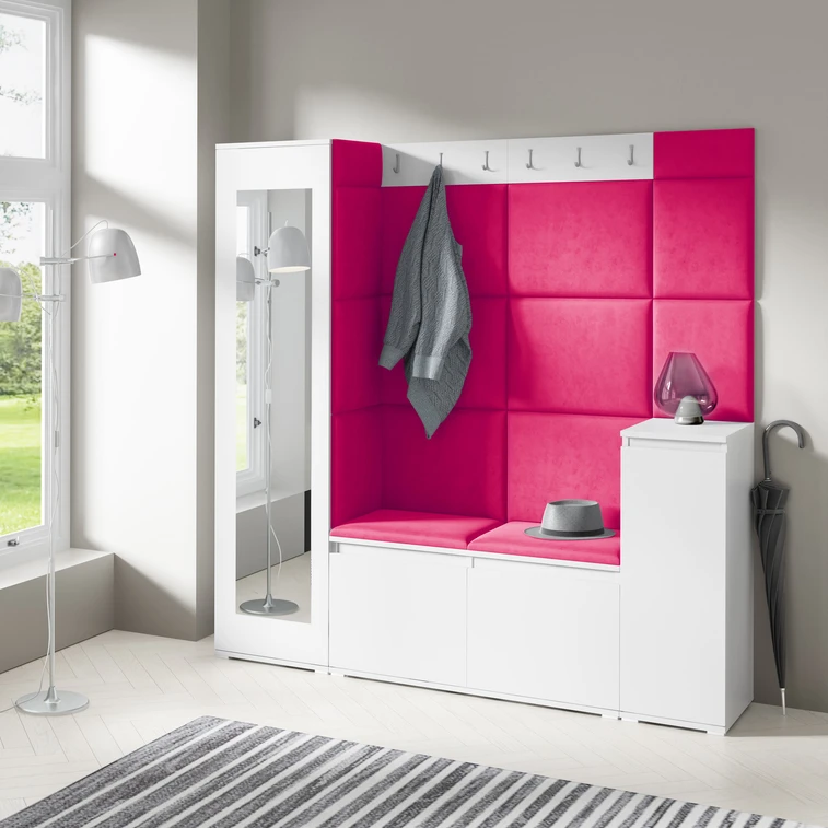Předsíňová stěna AMI 28, je moderní a praktický prvek do vstupních prostor vašeho domu. Předsíňová stěna obsahuje patnáct čalouněných panelů, které se montují přímo na stěnu za pomoci lepidla. Potah botníku je tkanina TRINITY, která je měkká a příjemná na dotek. Jedná se o velurovou tkaninu. Předsíňová stěna se skládá z několika částí.