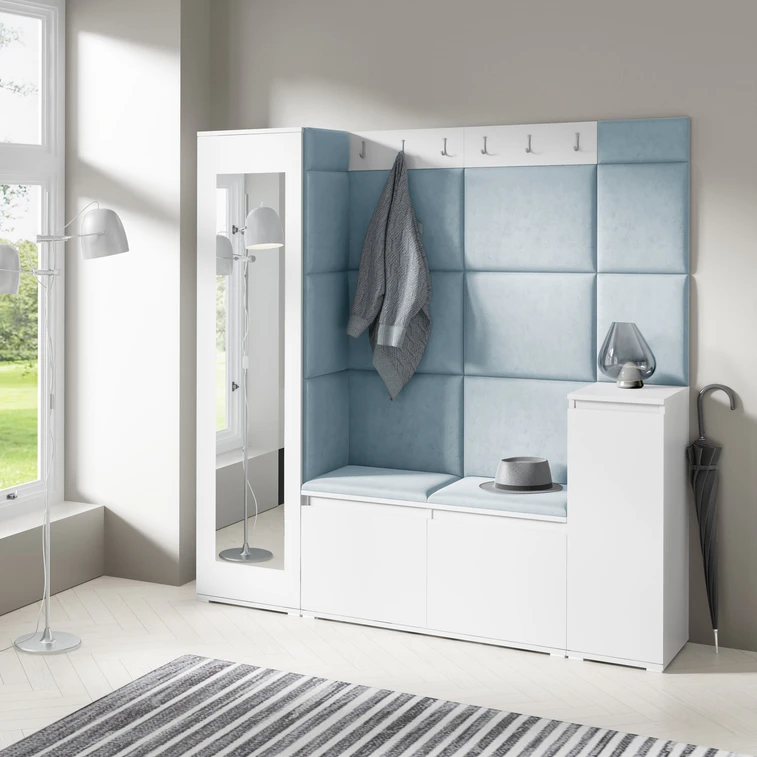 Předsíňová stěna AMI 28, je moderní a praktický prvek do vstupních prostor vašeho domu. Předsíňová stěna obsahuje patnáct čalouněných panelů, které se montují přímo na stěnu za pomoci lepidla. Potah botníku je tkanina TRINITY, která je měkká a příjemná na dotek. Jedná se o velurovou tkaninu. Předsíňová stěna se skládá z několika částí.