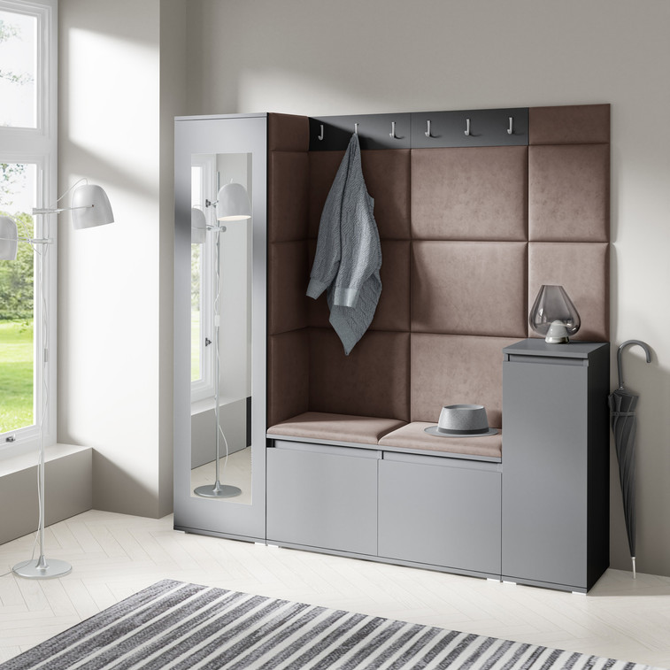 Předsíňová stěna AMI 28, je moderní a praktický prvek do vstupních prostor vašeho domu. Předsíňová stěna obsahuje patnáct čalouněných panelů, které se montují přímo na stěnu za pomoci lepidla. Potah botníku je tkanina TRINITY, která je měkká a příjemná na dotek. Jedná se o velurovou tkaninu. Předsíňová stěna se skládá z několika částí.