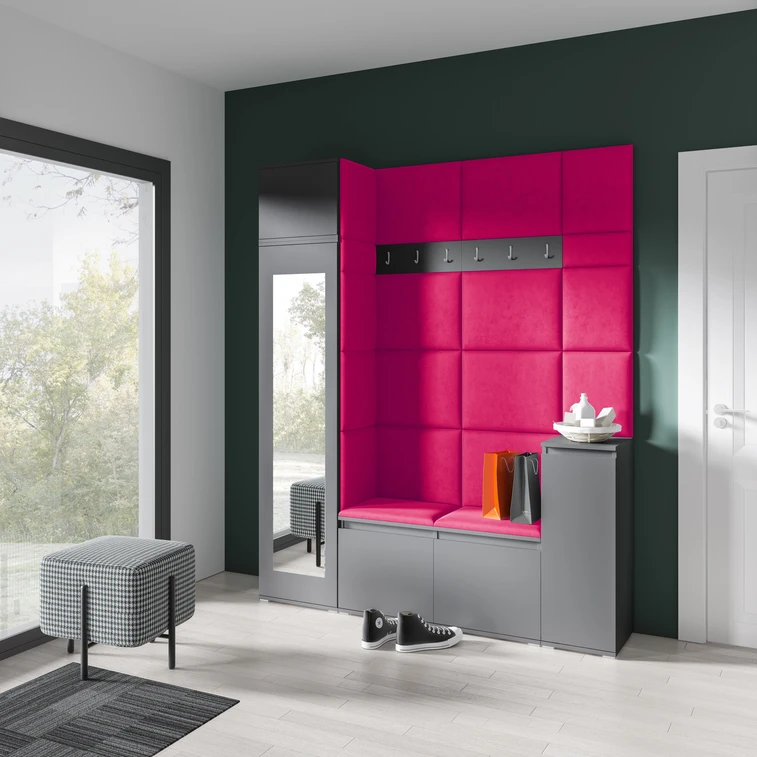 Předsíňová stěna AMI 29, je moderní a praktický prvek do vstupních prostor vašeho domu. Předsíňová stěna obsahuje devatenáct čalouněných panelů, které se montují přímo na stěnu za pomoci lepidla. Potah botníku je tkanina TRINITY, která je měkká a příjemná na dotek. Jedná se o velurovou tkaninu. Předsíňová stěna se skládá z několika částí.