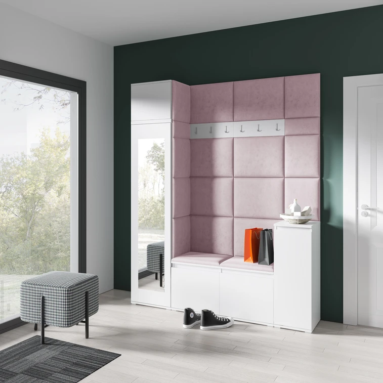 Předsíňová stěna AMI 29, je moderní a praktický prvek do vstupních prostor vašeho domu. Předsíňová stěna obsahuje devatenáct čalouněných panelů, které se montují přímo na stěnu za pomoci lepidla. Potah botníku je tkanina TRINITY, která je měkká a příjemná na dotek. Jedná se o velurovou tkaninu. Předsíňová stěna se skládá z několika částí.