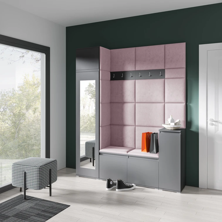 Předsíňová stěna AMI 29, je moderní a praktický prvek do vstupních prostor vašeho domu. Předsíňová stěna obsahuje devatenáct čalouněných panelů, které se montují přímo na stěnu za pomoci lepidla. Potah botníku je tkanina TRINITY, která je měkká a příjemná na dotek. Jedná se o velurovou tkaninu. Předsíňová stěna se skládá z několika částí.