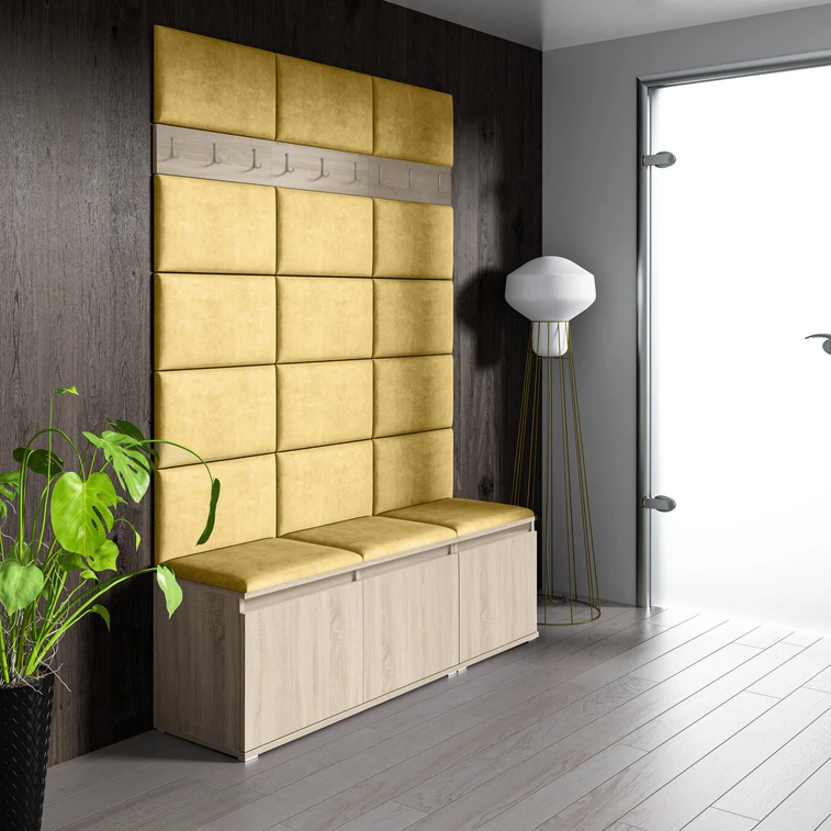 Předsíňová stěna AMI 6, je moderní a praktický prvek do vstupních prostor vašeho domu. Předsíňová stěna obsahuje osmnáct čalouněných panelů, které se montují přímo na stěnu za pomoci lepidla. Potah botníku je tkanina TRINITY, která je měkká a příjemná na dotek. Jedná se o velurovou tkaninu. Předsíňová stěna se skládá z několika částí.