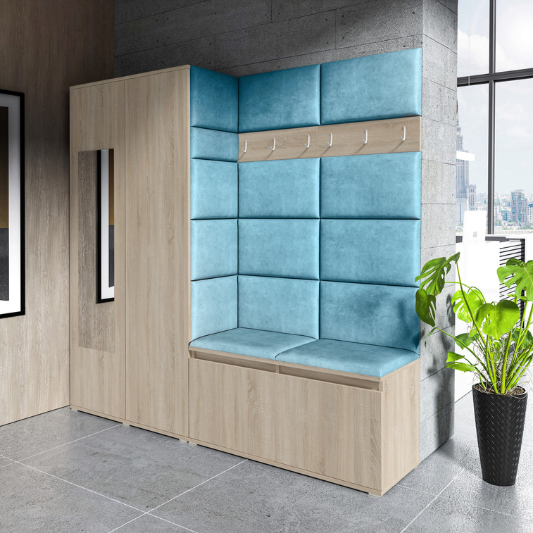 Předsíňová stěna AMI 8, je moderní a praktický prvek do vstupních prostor vašeho domu. Předsíňová stěna obsahuje patnáct čalouněných panelů, které se montují přímo na stěnu za pomoci lepidla. Potah botníku je tkanina TRINITY, která je měkká a příjemná na dotek. Jedná se o velurovou tkaninu. Předsíňová stěna se skládá z několika částí.