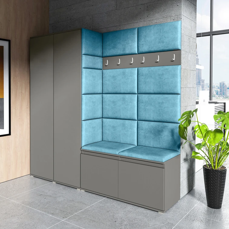 Předsíňová stěna AMI 8, je moderní a praktický prvek do vstupních prostor vašeho domu. Předsíňová stěna obsahuje patnáct čalouněných panelů, které se montují přímo na stěnu za pomoci lepidla. Potah botníku je tkanina TRINITY, která je měkká a příjemná na dotek. Jedná se o velurovou tkaninu. Předsíňová stěna se skládá z několika částí.